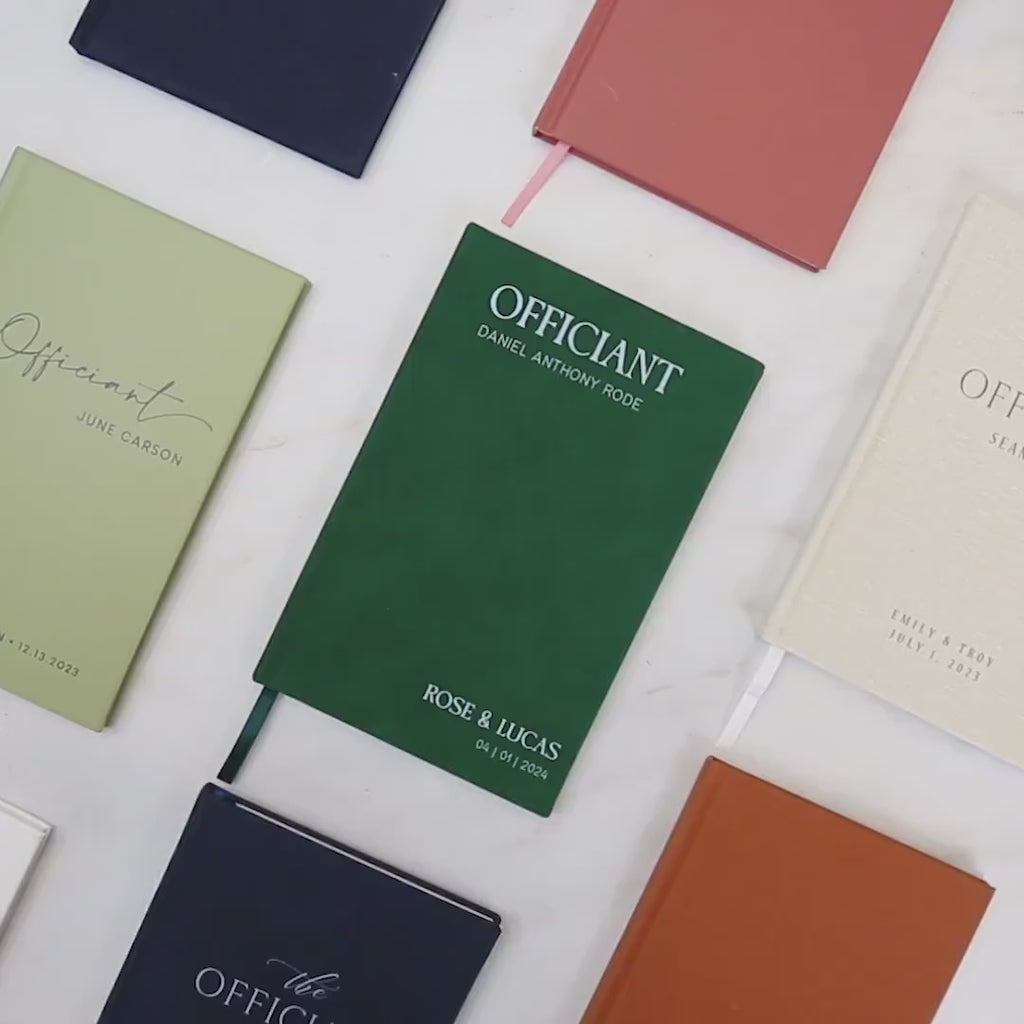 - Make your officiant book truly your own. Choose from 8 beautiful hardcover colors, add your officiant's name and wedding details to the cover, and select your preferred font color. Organize vows and ceremony details with ease, creating a personalized and professional tool for any wedding ceremony.